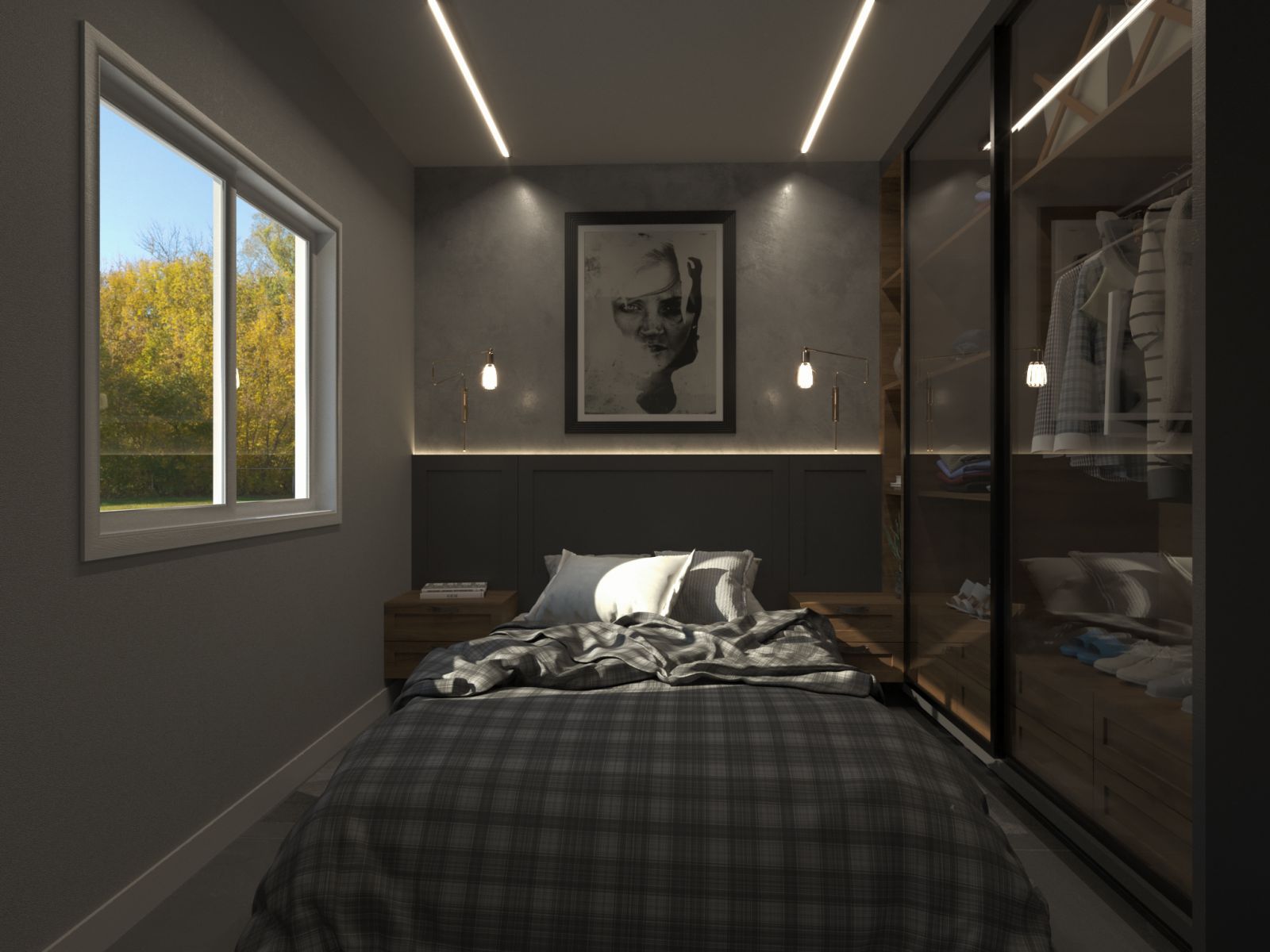 Nesse dormitório temos uma energia um pouco diferente. Com cores e elementos em preto e chumbo, deixando o ambiente com um toque industrial moderno, juntamente com a madeira em freijó presente nos móveis de apoio laterais e no roupeiro.