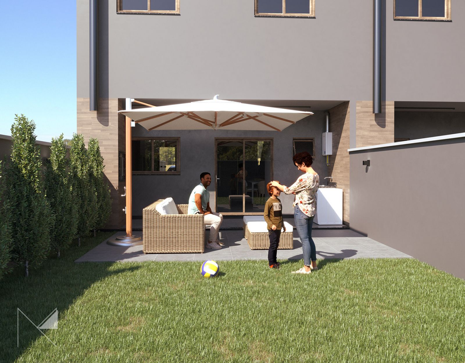 Com uma planta baixa no térreo em conceito aberto e uma área externa com churrasqueira, com vista para um amplo quintal. No pavimento superior contamos com 3 dormitórios (sendo um deles uma suíte) e um banheiro social. Uma ampla sacada na fachada principal, com uma grande porta de madeira, traz uma conexão com o exterior, sem falar na vista para o Morro Ferrabraz, lindíssima! Os espaços foram pensados para o conforto do usuário, pensando na ventilação e iluminação natural dos espaços.